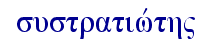| 04961 συστρατιώτης, ου, ὁ 名词 在军队中的伙伴,「一同当兵的人」,在新约中仅为喻意,指那些致力于福音的人;为一尊贵的名称,用在 腓2:25 门1:2 中所提到的几位保罗的同工身上。* 说明 |